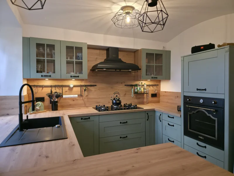 Schon beim ersten Betreten des Raumes war spürbar, dass hier alles zusammenfinden sollte: Tradition und Moderne, warme Materialien und klare Formen. Die Kundin wünschte sich eine Küche, die sich harmonisch in den offenen Wohnraum einfügt