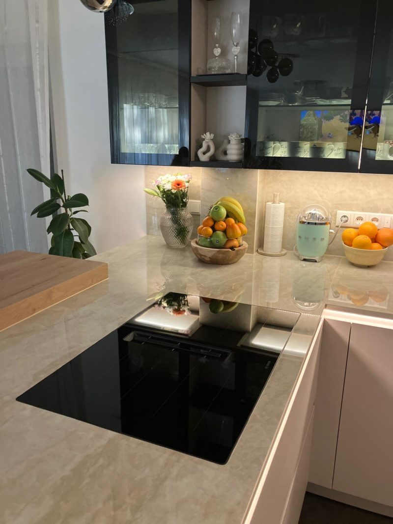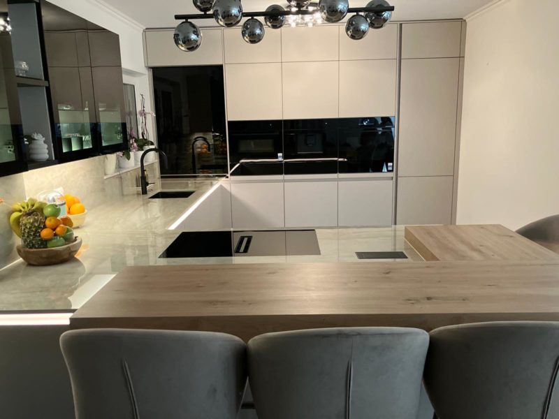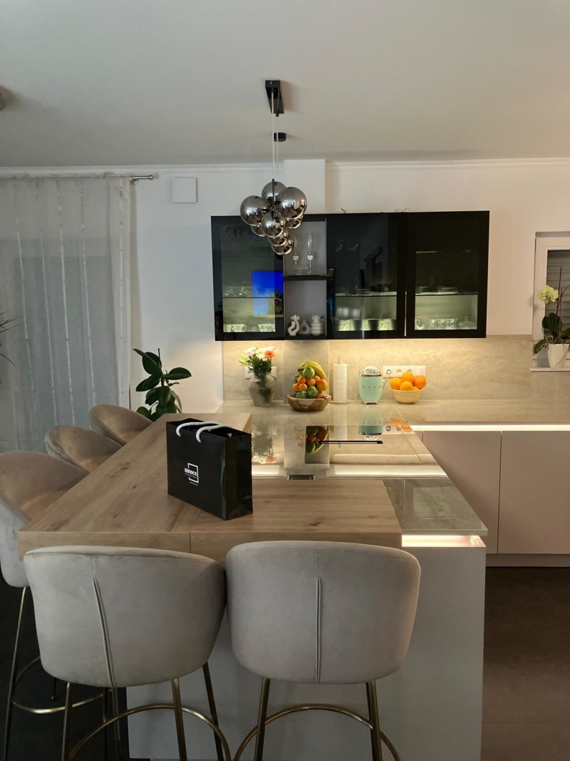 Die Ausgangssituation war bereits besonders: Eine bestehende L-Küche mit separater, kleiner Insel, eingebettet in einen offenen Wohn- und Essbereich. Doch genau diese Trennung empfand der Kunde im Alltag als Bruch.