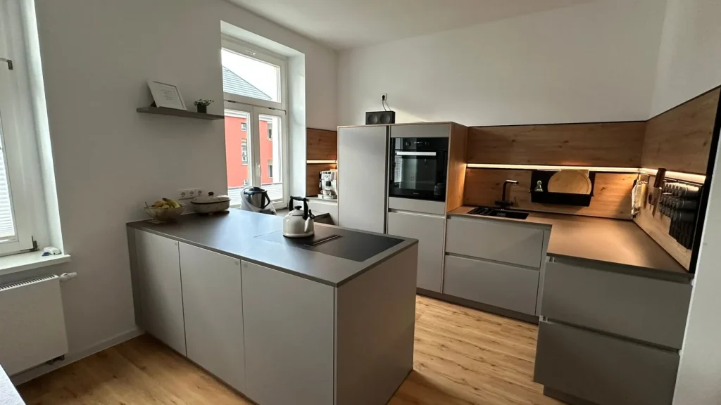 Neben den Fronten spielen Materialien eine zentrale Rolle. Holz bleibt ein wichtiger Bestandteil moderner Küchen, gerne mit sichtbarer Maserung und in warmen Farbtönen. Es vermittelt Geborgenheit und schafft eine Verbindung zum Wohnbereich.
