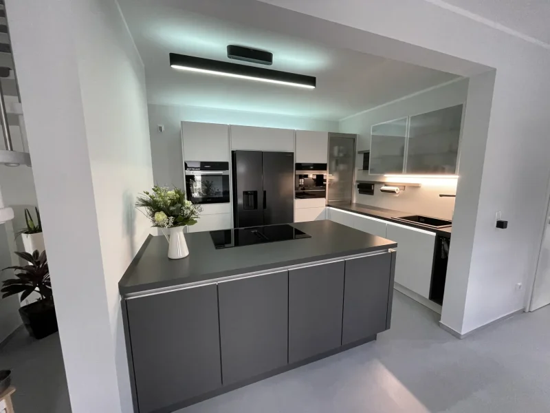 Ein weiteres Highlight ist das integrierte Kochfeld mit Dunstabzug direkt in der Arbeitsplatte. Es ermöglicht eine minimalistische Optik, da keine Haube mehr an der Wand hängt, und sorgt für freie Sicht in offene Wohnbereiche.